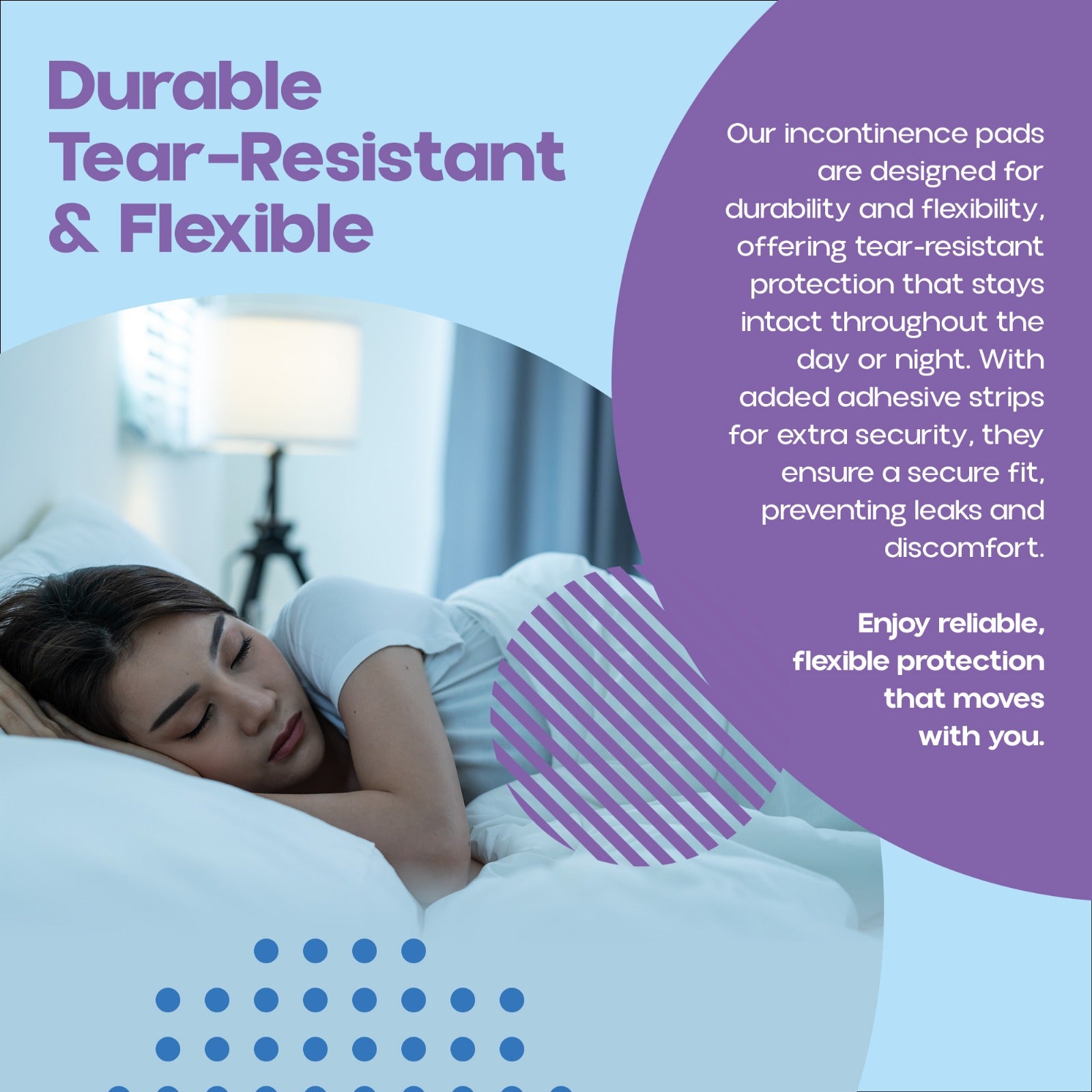- Secure Adhesive Strips - Including two extra strong hold adhesive strips along the longest sides, users can anchor the pad to any surface preventing bunching and maximising leak prevention.