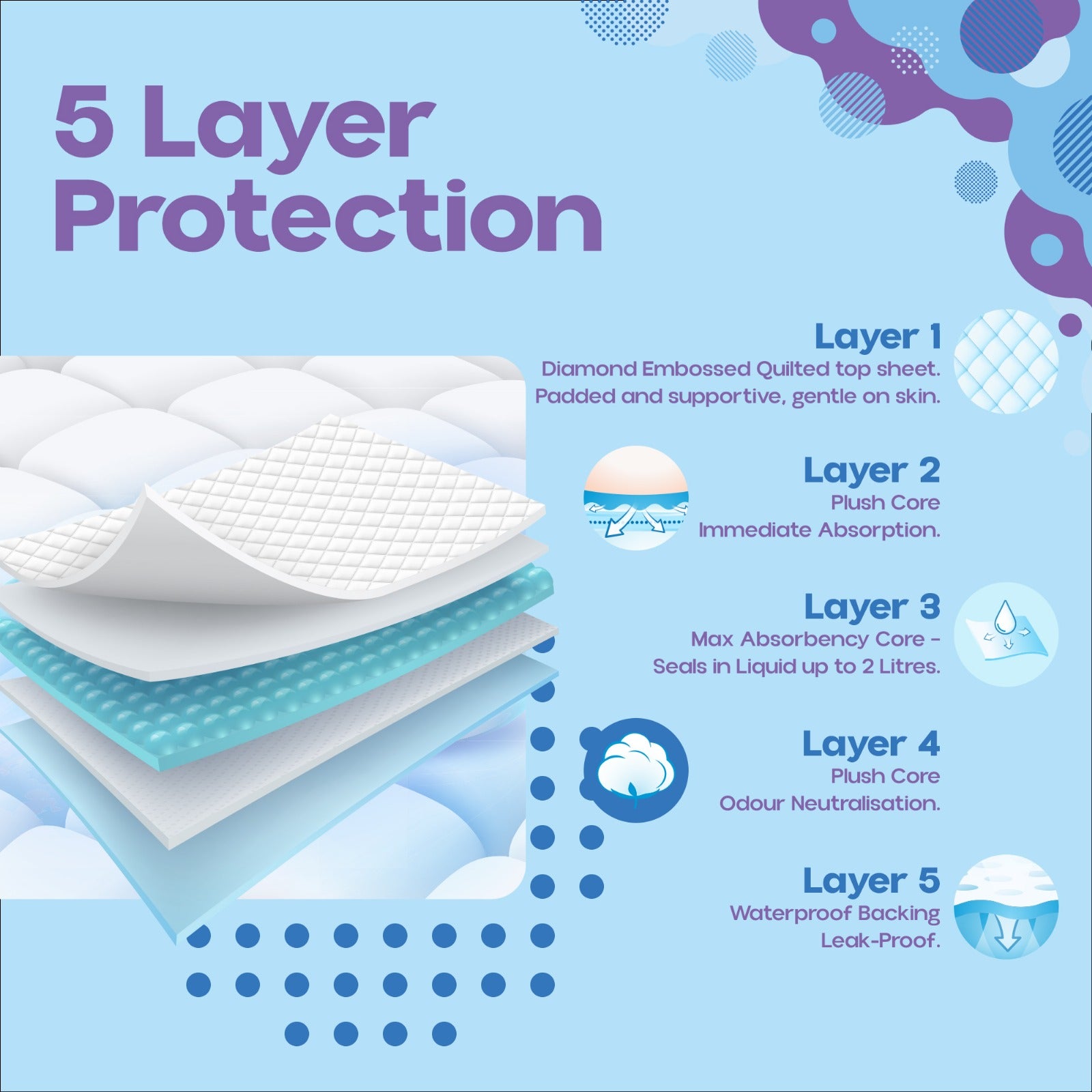- Highly Absorbent Rapid Lock Core – Advanced rapid lock technology quickly absorbs and retains liquids, keeping beds and furniture dry and preventing leaks up to 2 litres across the total surface area of the pad.