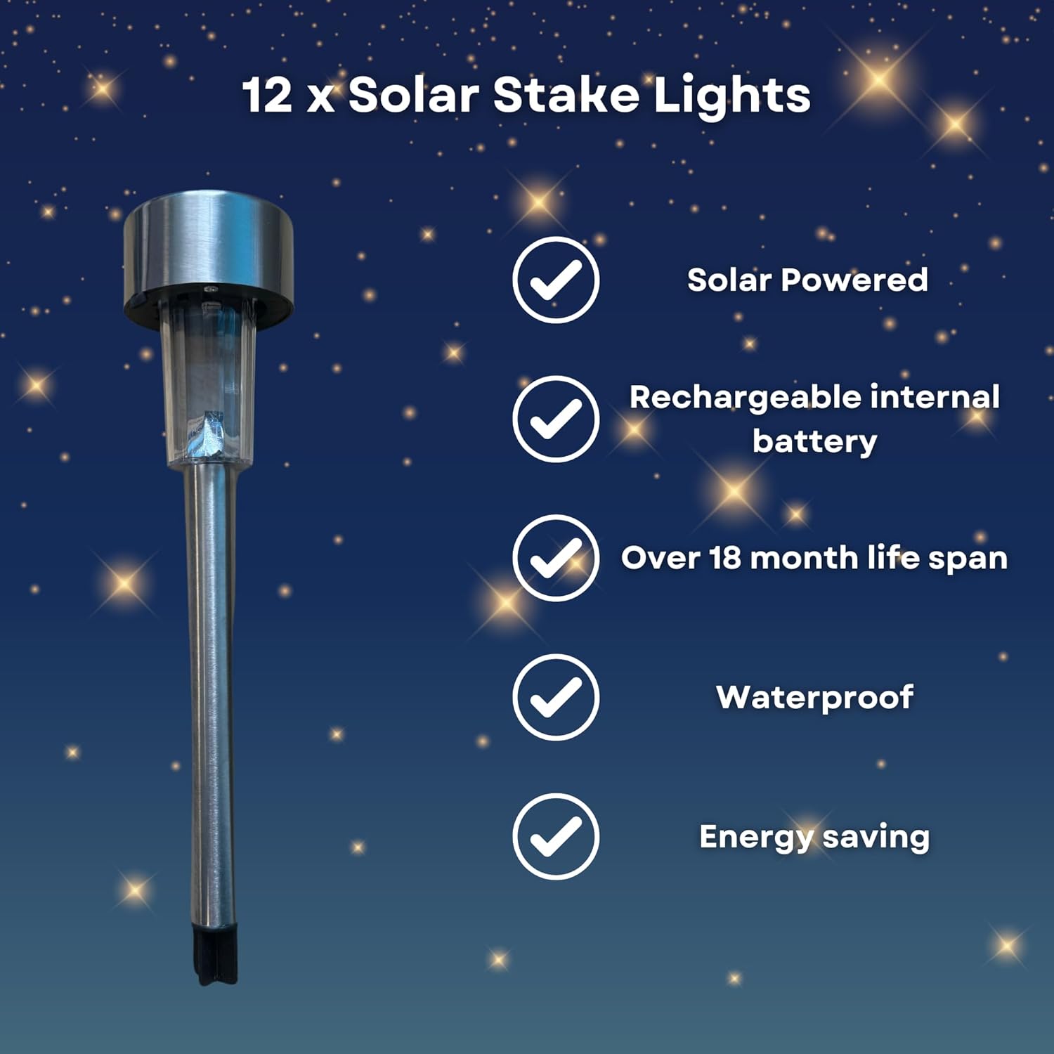- HUGE 12 PACK! Equipped with 12 individual stake lights, you are able to decorate any size garden with ease! Cover all basis with these white LED Solar Stake Lights!