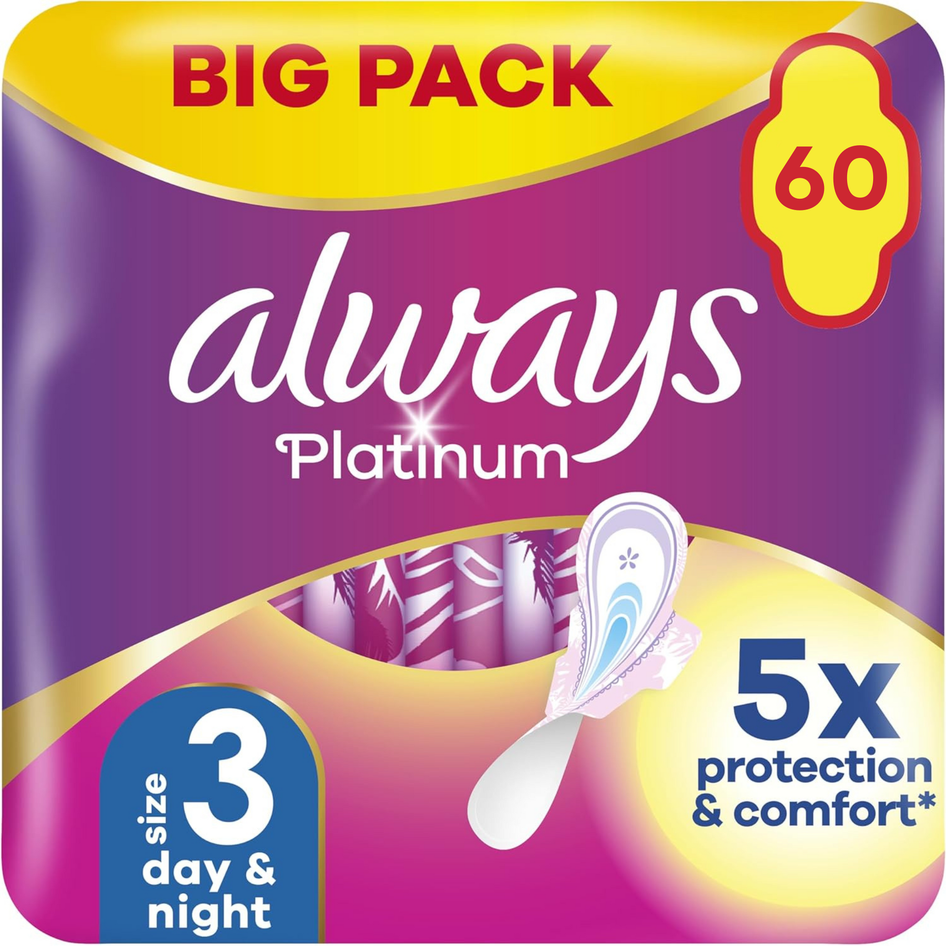- Always Platinum 5X Protection, now even softer*. (*5 product features that provide protection, and it is softer vs previous Always Platinum)
