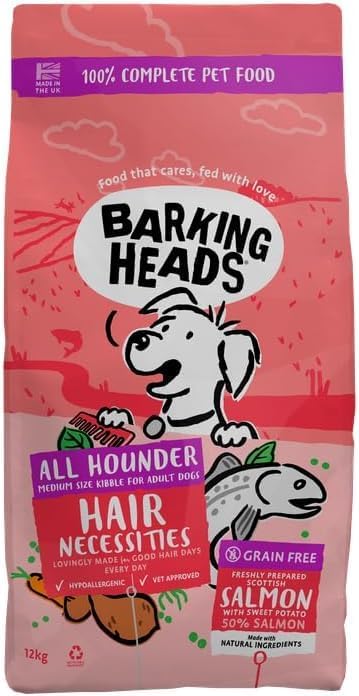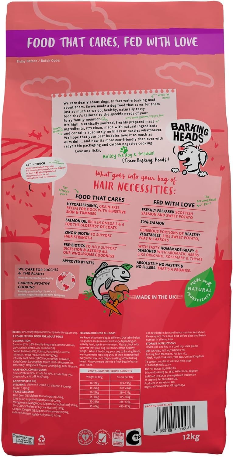 Barking Heads Complete Dry Dog Food 12kg - Adult All Hounder Hair Necessities Salmon - Natural Grain Free Hypoallergenic for Skin & Coat - Vet Approved